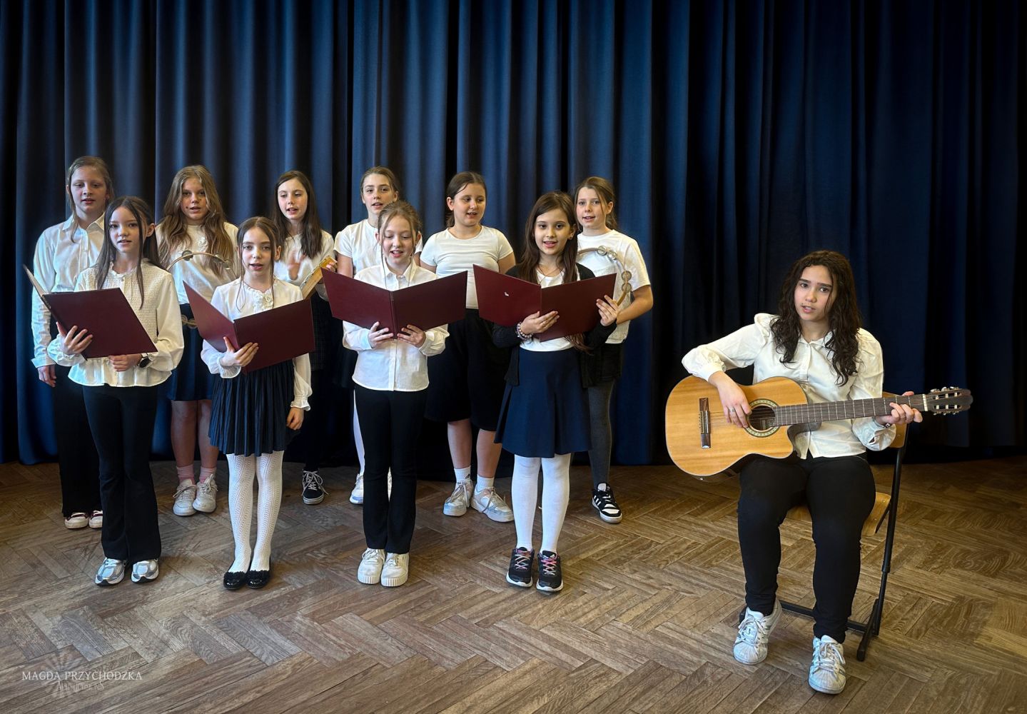Marzysz o śpiewaniu na scenie i przeżywaniu muzyki razem z innymi? Chcesz rozwijać swój talent, uczyć się prawidłowego oddychania, dbać o głos i radzić sobie z tremą? Zapraszamy do naszego szkolnego chóru prowadzonego przez Magdalenę Przychodzką – czynną wokalistkę sceniczną, która z pasją inspiruje młodych artystów do odkrywania swoich muzycznych uzdolnień.