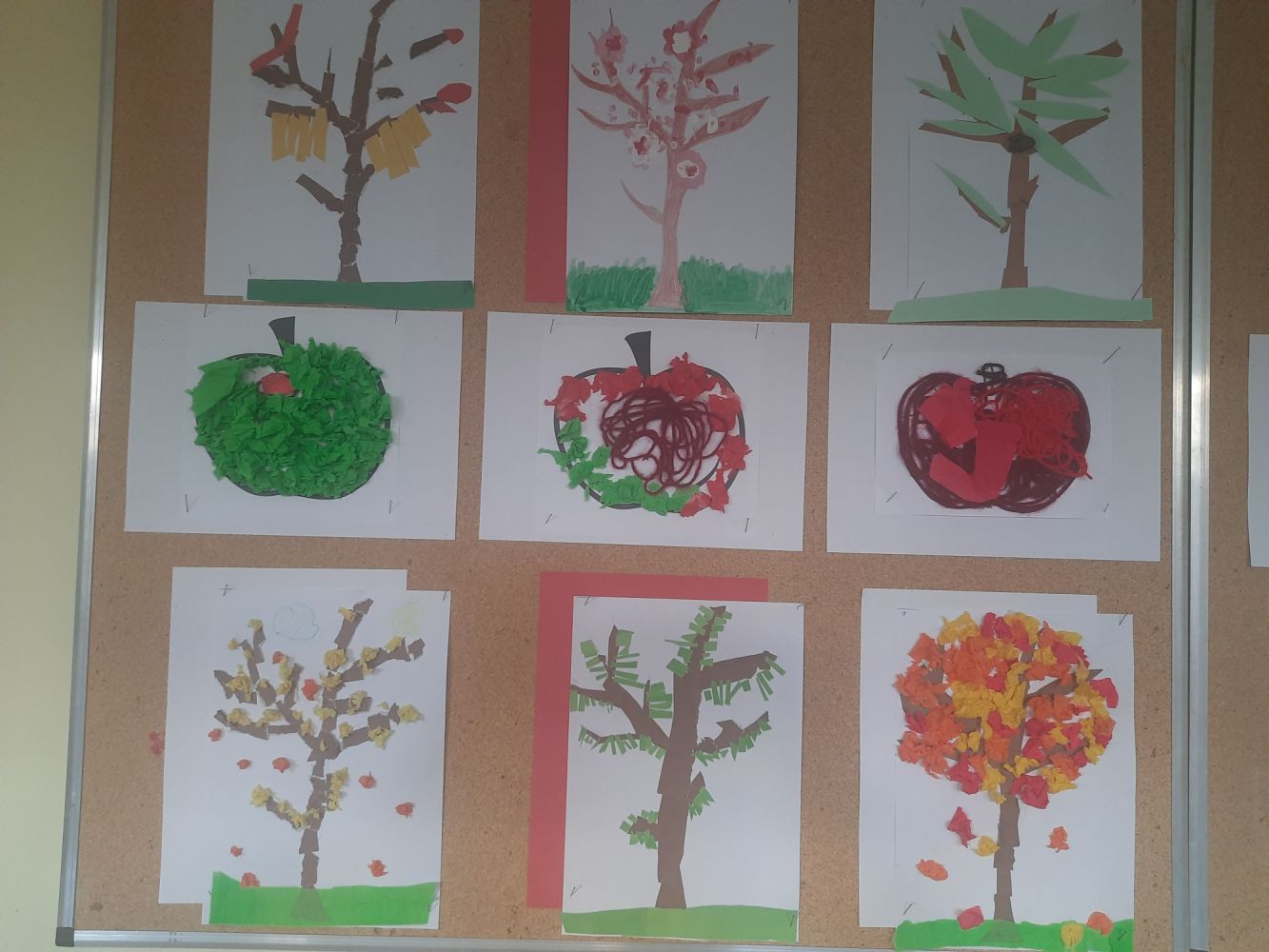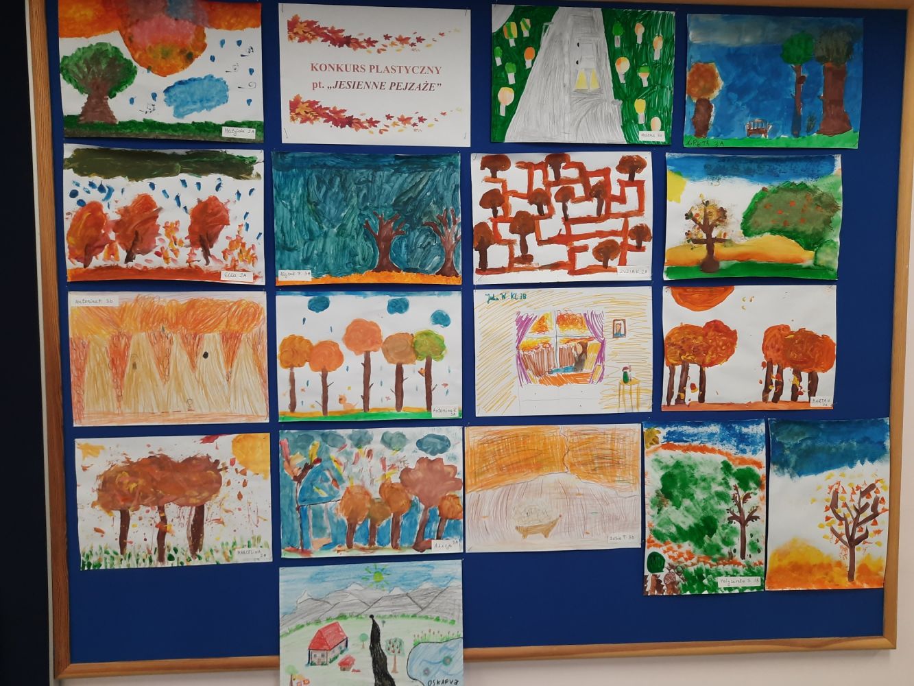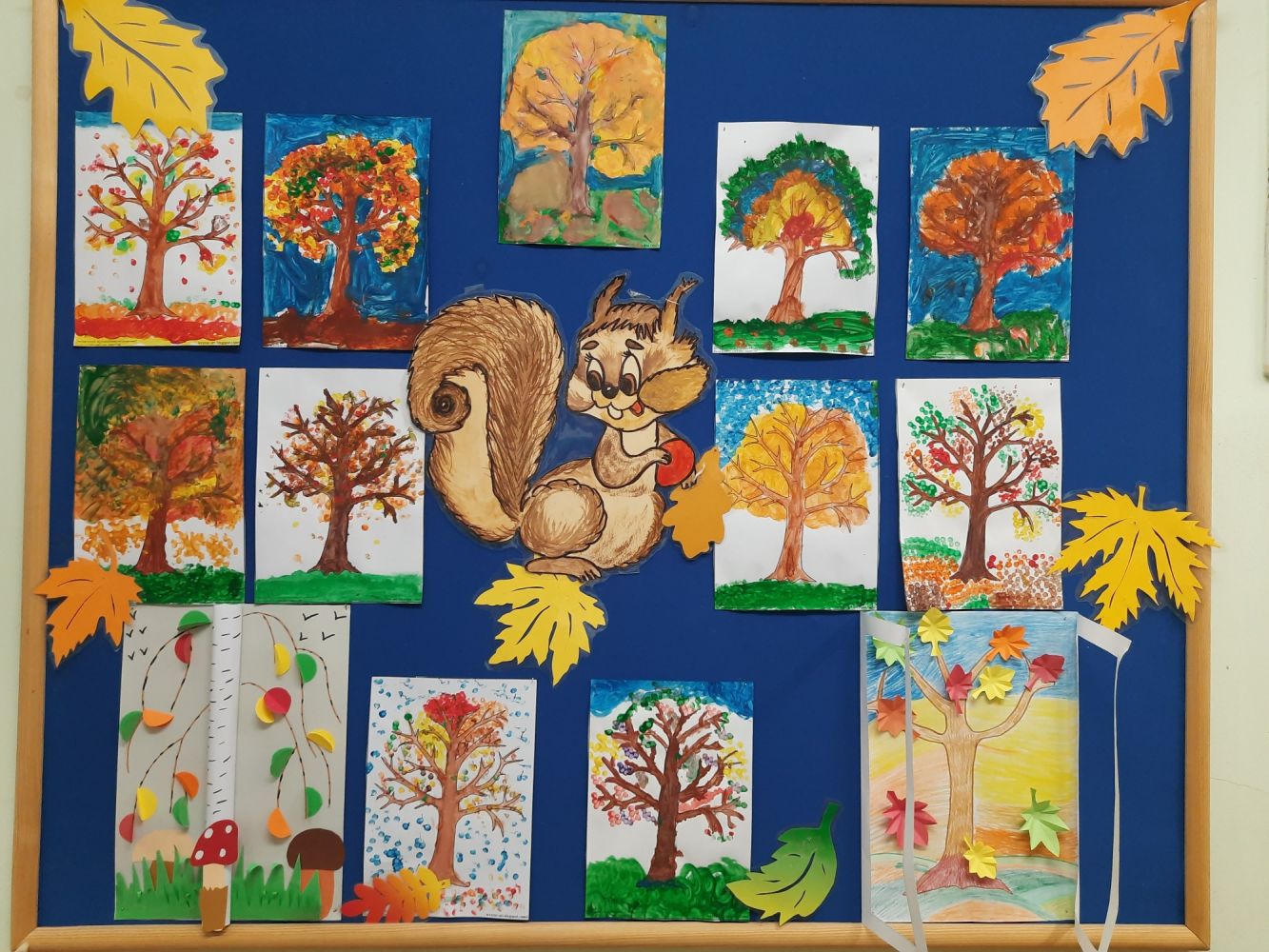 Kolorowe liście unoszone podmuchem wiatru wiruja wokół drzew, a dojrzałe kasztany i żołędzie zachęcają do radosnych zabaw i tworzenia przeróżnych postaci bajkowych. W sadach i ogrodach dobiega końca zbieranie pysznych, zdrowych owoców i warzyw. Skrzydlaci przyjaciele dawno opuścili swoje gniazda szukając ciepłych promieni słońca i bardziej sprzyjających warunków. Nowa pora roku jest wdzięcznym tematem do powstającej galerii prac naszych uczniów.